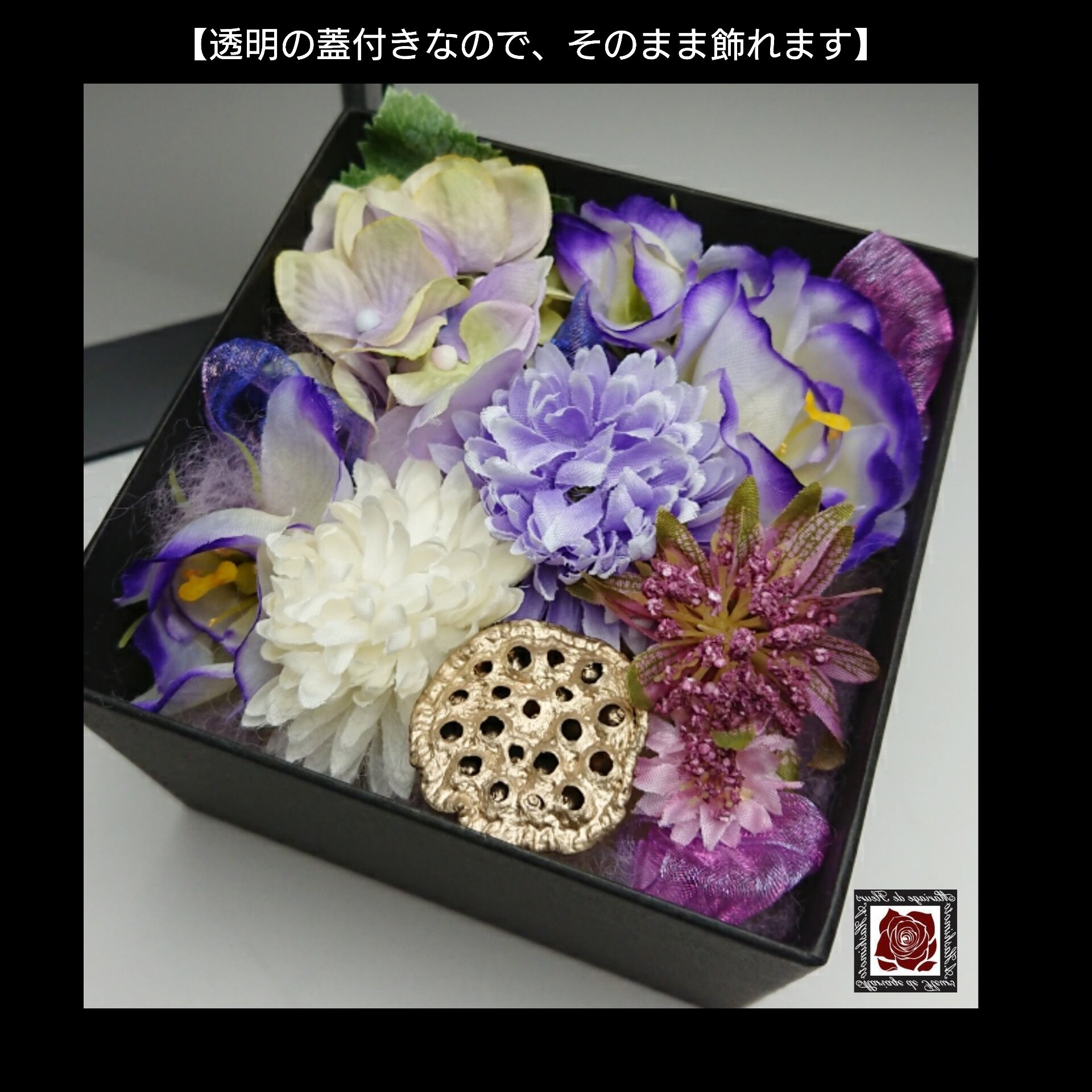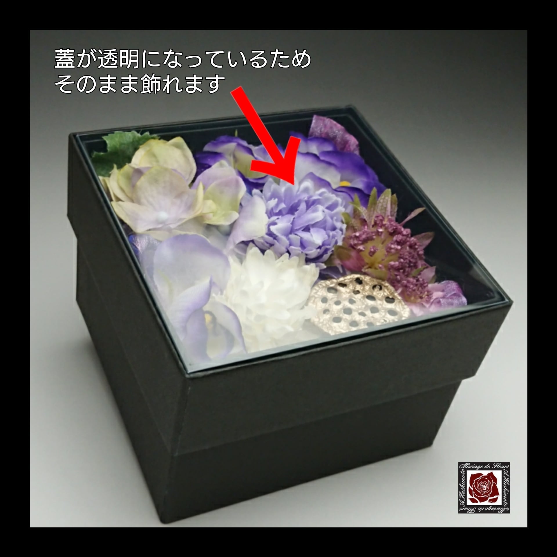 蓋が透明なので、そのまま飾れるお供え用のお花です。また、アーティフィシャルフラワー(造花)なので、水やりなどの手間がありません。ご自宅用にはもちろん、お供えでお渡しするお花におすすめです。
